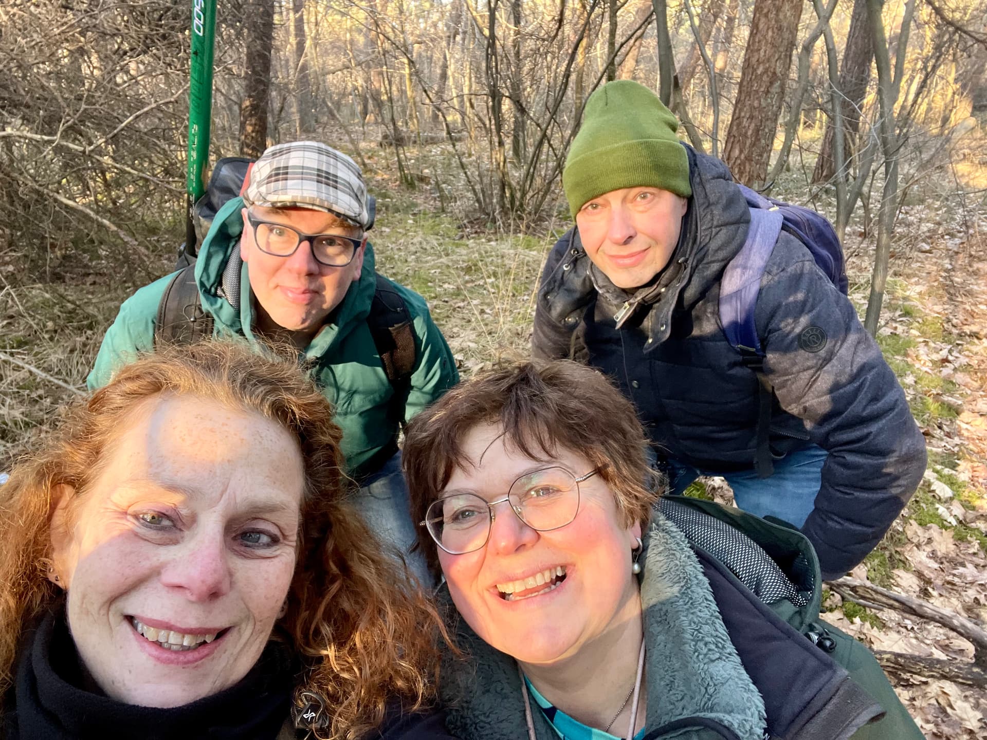 Maar die hengel…….is en blijft maar in de rugzak. Tot het laatste waypoint. Daar hangt de cache, op een meter of 5 hoogte. Vernuftig knutselt MJ een kledinghangerhaak aan zijn hengel en hengelt hij professioneel de cache uit de boom. Als kleine kinderen zo blij verdringen we elkaar om hem te vangen. Met de uitkomst van deze cache puzzelen we ons naar de final location.